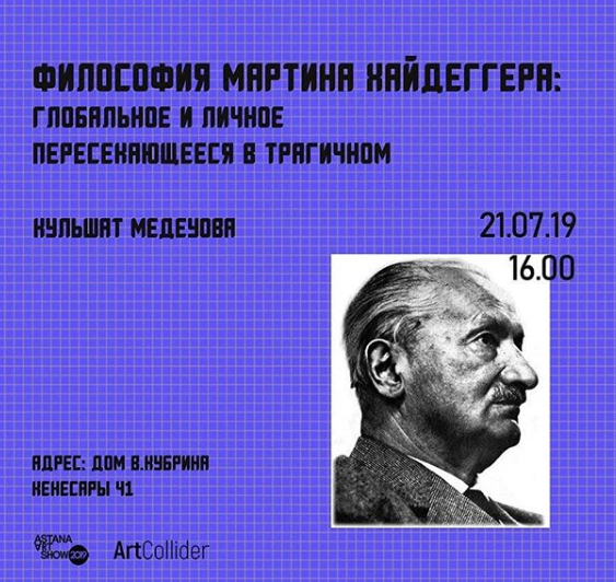 Лекция "Философия Мартина Хайдеггера: глобальное и личное, пересекающееся в трагическом". Лектор - Кульшат Медеуова, доктор философских наук, профессор кафедры философии ЕНУ имени Гумилева. Лекция проходит в рамках выставки "Воспоминания. Диалоги памяти". Место проведения - Дом Василия Кубрина по улице Кенесары, 41.