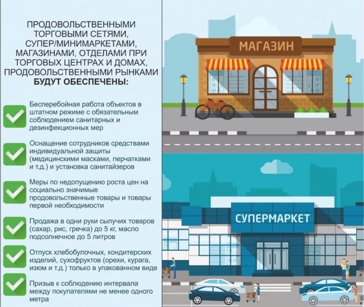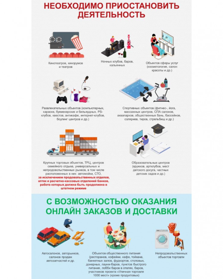 - Приостановлена работа кафе, ресторанов (работают только на вынос), ночных клубов, магазинов одежды, детских игровых зон, спортивных центров и так далее.