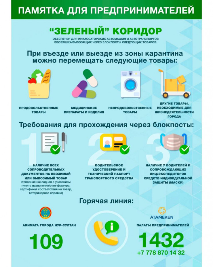 На всех блокпостах столицы для бесперебойной доставки продовольствия и товаров первой необходимости организован "зеленый коридор": водителям и экспедиторам необходимо иметь маски, удостоверение личности, техпаспорт, документы на товар. Также акиматом города разработано мобильное приложение и внедрено на планшеты полицейских: это позволит пропускать сотрудников, обеспечивающих жизнеобеспечение города, и сократит время регистрации.
