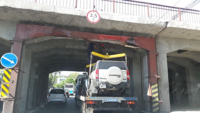 Курьез дня. Полицейский эвакуатор с "грузом" застрял под мостом в Алматы Фото очевидцев