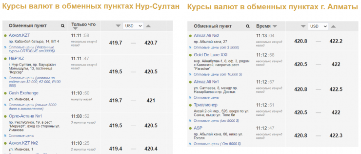 В пунктах обмена валюты Нур-Султана доллар продают по 420,4-421 тенге, покупают по 419,4-419,7 тенге.