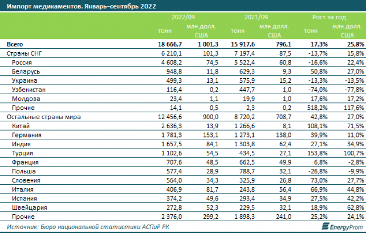 За девять месяцев 2022 года в Казахстан импортировали лекарств на миллиард долларов. В натуральном выражении импорт вырос на 17,3 процента, в денежном – на 25,8 процента.