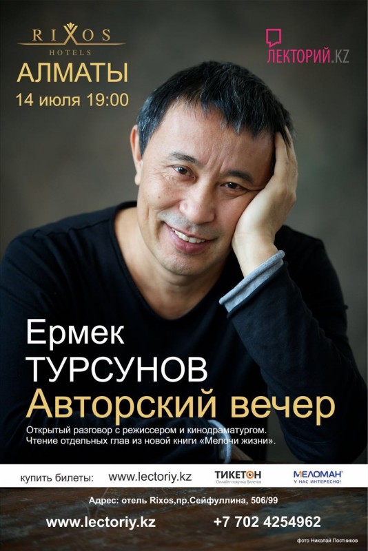 14 июля Лекторий.kz приглашает казахстанцев на откровенный разговор с режиссером и кинодраматургом Ермеком Турсуновым, передает корреспондент Tengrinews.kz. В программе вечера - чтение отдельных глав из новой книги "Мелочи жизни". Авторский вечер пройдет в RIXOS Almaty в 19.00.