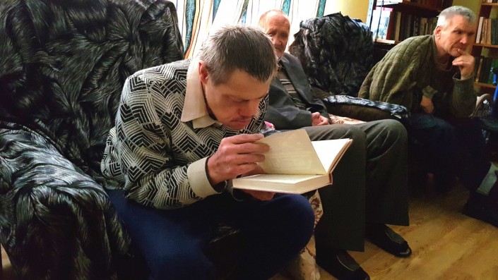 В нем Виталий живет больше полугода. Сначала он был немного напуган, но быстро привык к здешним правилам и людям. Видно, что жизнью большой ребенок доволен: у него есть любимые игрушки, а на Новый год подарок ему принес сам Дед Мороз. Тех, кто за ним ухаживает, Виталий называет мамами и папами. Читать он не умеет, зато блестяще подражает собравшимся в библиотеке: сосредоточенно смотрит в книгу, слюнявит палец, перелистывает страницы, бормочет что-то под нос и хмурит брови. А еще любит петь и танцевать: маленькие концерты с восторгом встречают и сотрудники, и жители центра.