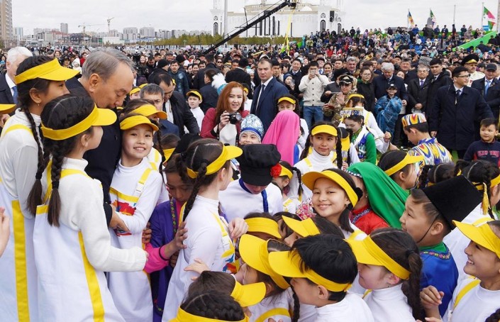 На одном из фото Нурсултан Назарбаев запечатлен в окружении детей. Фотография сделана в столице, на фоне видна мечеть Хазрет Султан.