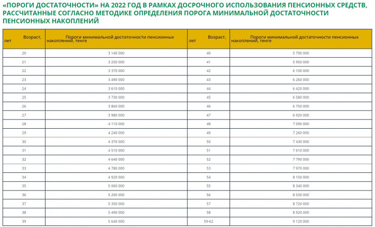 Ранее стало известно, что в Казахстане с 2022 года значительно увеличат порог достаточности для снятия пенсионных накоплений. Согласно данным на сайте ЕНПФ, с 2022 года для 20-летних порог достаточности будет составлять 3,1 миллиона тенге. Сейчас - 1,7 миллиона тенге.