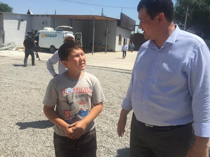 Мальчик с первых дней разгружает фуры, формирует пакеты для каждой семьи, разносит воду грузчикам. Учится он в седьмом классе средней школы имени Кожанова в Арыси.