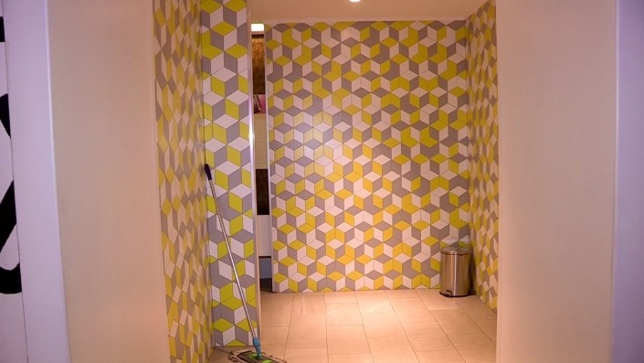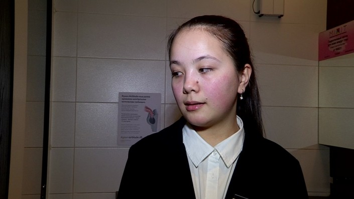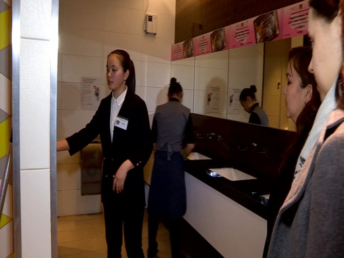Сотрудница охраны Ботагоз Алихан показывает место, где принимала роды у посетительницы торгового центра.