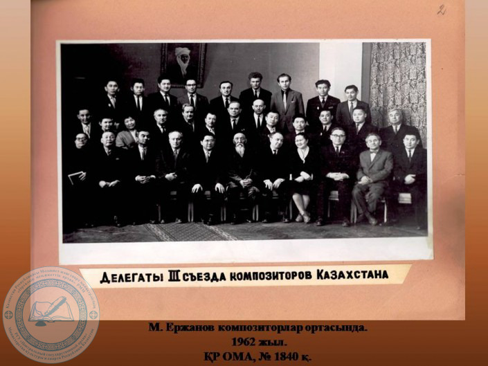 1962 жылы наурыздың 16 күні Қазақстан Композиторлар одағы басқармасының төрағасы Г.А. Жұбанованың басшылығымен өткен мәжілісте К. Кужамьяров, Е. Рахмадиев т.б. қатысуымен М. Ержановтың өтініші тыңдалды. Мәжілістің шешімі бойынша: "Ержановтың барлық күйі мен әнін радиоға жазып алуды және оларға бағдарламалар ұйымдастыруды, Ержановтың жазылған, өңделген күйлерімен әндерін Мәдениет министрлігіне тапсыруды, Ержановтың домбыраны тартудағы өзгеше нақышы мен орындаудағы тәсілдерін ескеріп Қазақфильмге түсіруге өтініш беруді" міне осыларды Қазақстанның Коммунистік Партиясының Орталық Комитетінің хатшысы Н. Жангельдинге хат жазу мәселесі шешіледі.