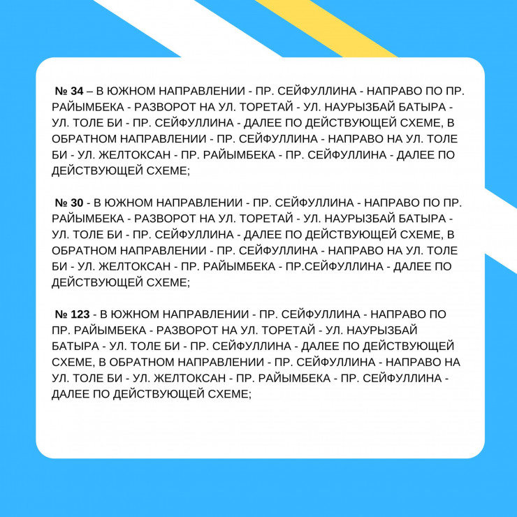 "По проспекту Сейфуллина с 17 по 18 июля в связи проводимыми дорожно-ремонтными работами будет внесено изменение в схемы троллейбусных и автобусных маршрутов. Приносим свои извинения за предоставленные неудобства и просим корректировать свой маршрут заранее", - говорится в сообщении.