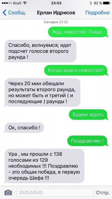 Премьер-министр Казахстана Карим Масимов опубликовал в Twitter переписку с министром иностранных дел Ерланом Идрисовым, в которой идет речь о ходе голосования во время избрания непостоянных членов Совета безопасности ООН, передает Tengrinews.kz.