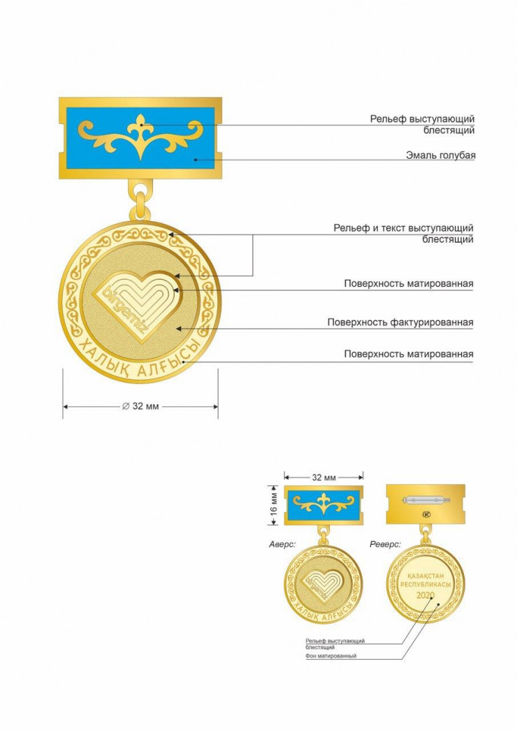 Согласно проекту медаль "Халық алғысы" будет состоять из знака и колодки. Знак медали представляет собой правильный круг диаметром 32 миллиметра, выполненный из металла золотистого цвета - латуни.
