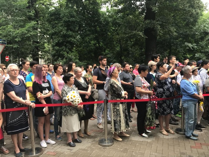 Мемориал открыли под композицию Дениса She Won't Be Mine. На церемонии присутствовали заместитель акима Алматы Арман Кырыкбаев, олимпийский чемпион по боксу Ермахан Ибраимов, тяжелоатлет Илья Ильин, народная артистка СССР Роза Рымбаева, народная артистка Казахстана Жания Аубакирова и многие другие.