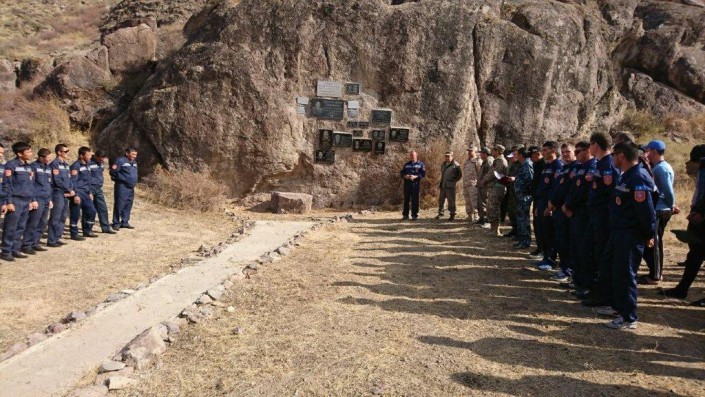 В "Скальном городе - Астана", на базе учебно-тренировочного полигона КЧС МВД РК, где проходит республиканский сбор-семинар "Казспас-2017", спасатели Восточного регионального аэромобильного оперативного спасательного отряда (ВРАОСО) установили мемориальную доску погибшему коллеге Елдосу Нурпеисову.