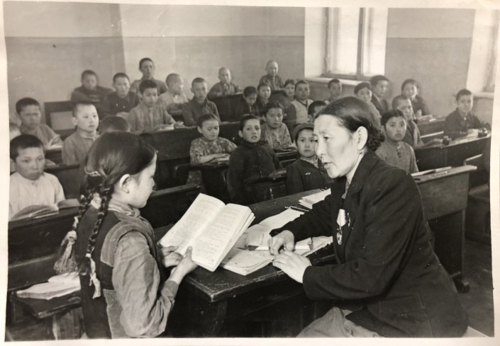 Урок арифметики в меркенской средней школе. На девочке - пионерский галстук и платье с цветочным узором.