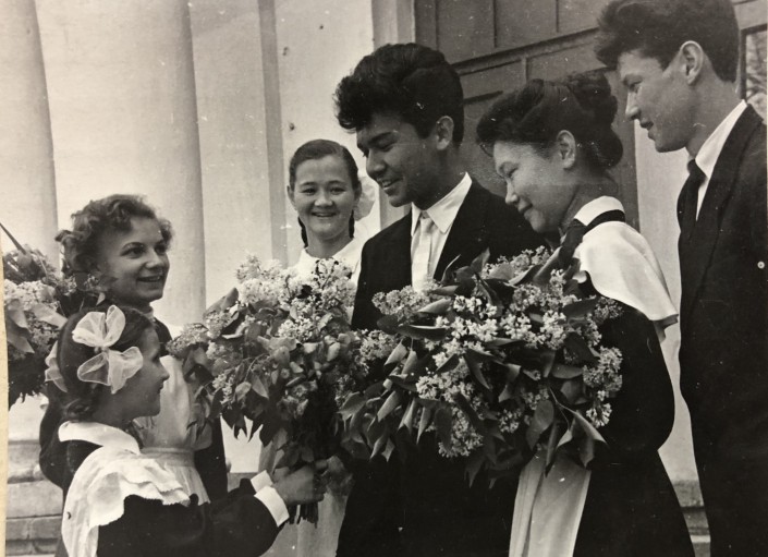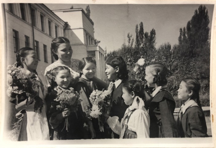 1960 год. Первоклассники школы № 28 Алма-Аты дарят цветы выпускникам. Здесь можно заметить, что изменилось "плечо" передника у ученицы младших классов. Похоже, что в этот период вошли в моду фартуки с широкими лямками в виде воланов. У парней-десятиклассников строгие классические пиджаки и галстуки.