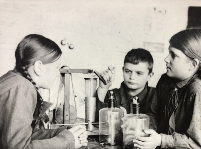 Пятиклассники алма-атинской школы № 8 на занятиях в кружке для юных физиков. 1939 год. Как и на предыдущем фото, школьники одеты в однотонную одежду. На девочке, что справа на фото, также верхняя рубашка с галстуком.