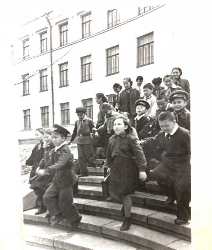 1958 год. После уроков. 12-я школа Алма-Аты. Можно заметить, что многие мальчишки носили головные уборы - картузы или кепки.