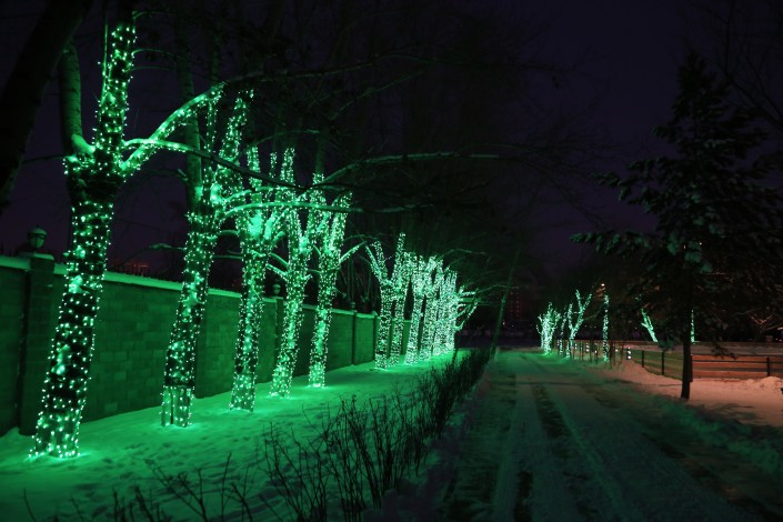 Ледовый каток в парке размером 600 квадратных метров, окружен деревьями, и в вечернее время световое оформление деревьев делает его очень красивым и романтичным.