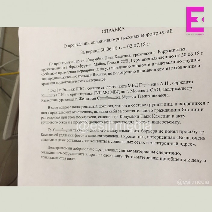 "В ходе допроса подозреваемый пояснил, что он в составе группы лиц, находящихся с ним в приятельских отношениях, выдавая себя за состоятельного гражданина Японии и разговаривая при этом по-казахски, склонил гражданку Колумбии к акту группового секса и в процессе данного акта производил фото- и видеосъемку. Гражданин также пояснил, что ввиду языкового барьера не понял просьбу гражданки Колумбии об удалении фото- и видеоматериалов, а кроме того, потерпевшая "была очень довольна и оставила свои контакты в социальных сетях и электронный адрес", - говорится в якобы официальном документе.