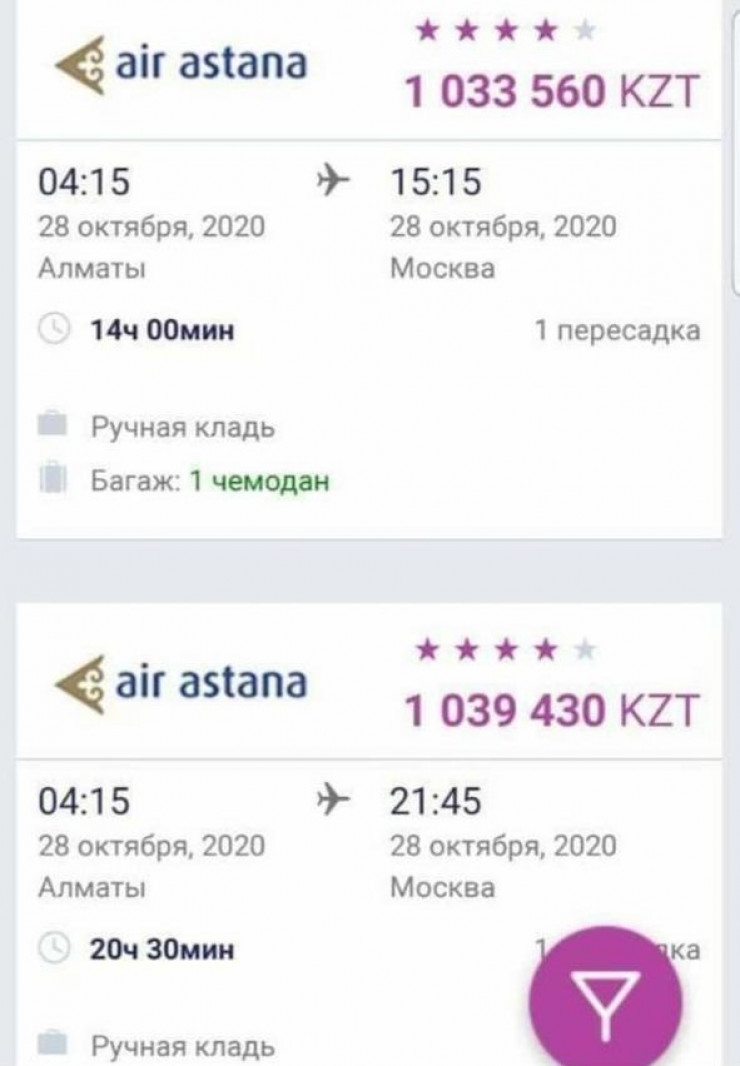 В социальных сетях распространялась информация о том, что один билет на рейс Нур-Султан - Москва сейчас стоит миллион тенге. Пользователи демонстрируют снимки расценок.
