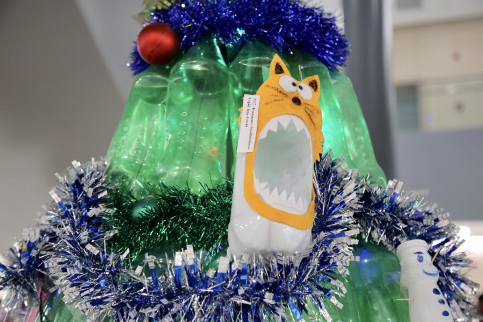 В рамках акции, которая прошла в стенах Международного центра зеленых технологий, была торжественно зажжена эко-елка. На создание столь необычной ели потребовалось порядка 250 единиц использованной пластиковой тары одинаковых цвета и размера.