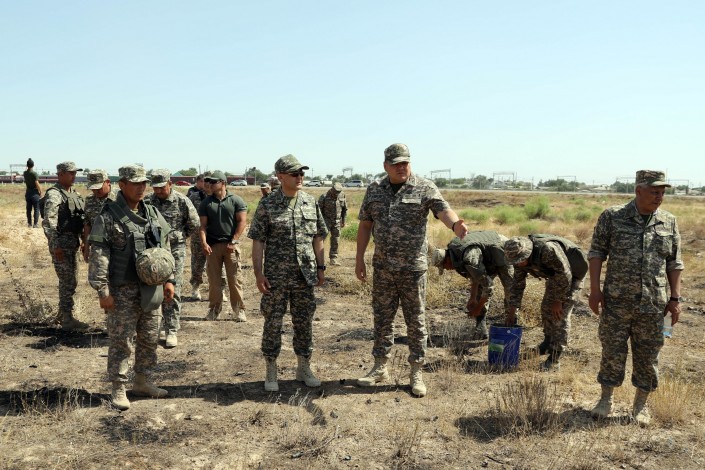 В ходе работы в городе Арысь министр обороны совершил облет окрестностей города, ознакомился с порядком погрузки оружия и боеприпасов на контейнеровозы, условиями быта военнослужащих в полевом лагере, условиями работы полевого пункта управления беспилотных летательных аппаратов, а также провел инструктаж для личного состава инженерных подразделений по разминированию и очистке местности.
