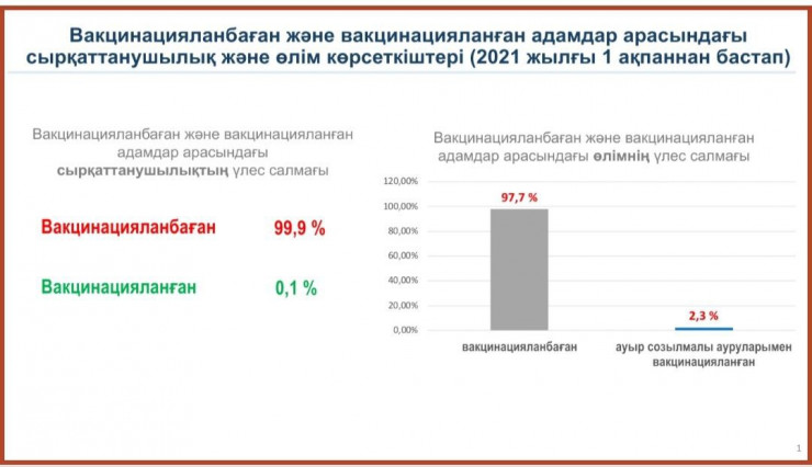 Үкімет отырысында Алексей Цой елімізде вакцина салдырған соң ауырғандардың үлесі небәрі - 0,1 пайыз екенін айтты. Ал екпе алмағандардың 99,9 пайызы вирус жұқтырған.
