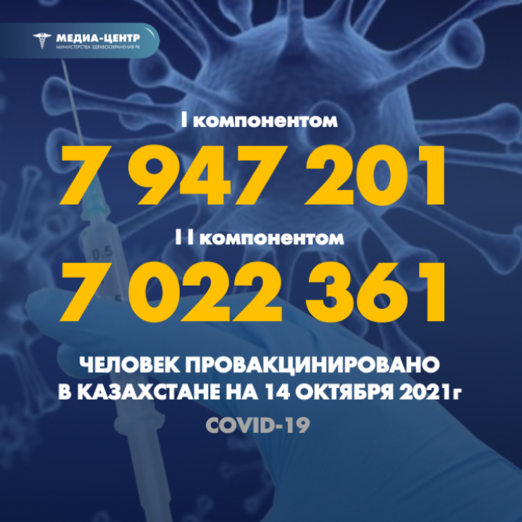 По данным ведомства на 14 октября, первым компонентом вакцины от коронавируса вакцинировали 7 947 201 человека, вторым компонентом - 7 022 361 человека.
