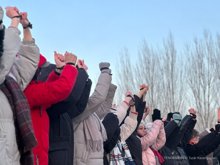 Собравшиеся устроили флешмоб со связанными руками в знак того, что женщины Казахстана не имеют возможности противостоять домогательствам на законодательном уровне.