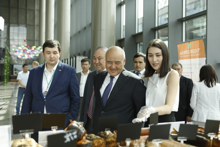 В холле киноконцертного зала расположилась сельскохозяйственная выставка. Производители из разных регионов страны представляли свою продукцию заместителю премьер-министра - министру сельского хозяйства Умирзаку Шукееву и даже предлагали ее попробовать.