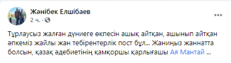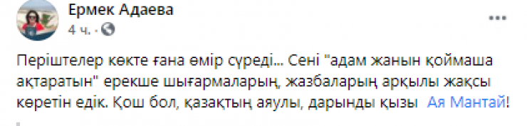 29 июля умерла молодая казахстанская писательница Аягуль Мантай. Информацию о смерти девушки подтвердили в Департаменте полиции Туркестанской области, заведено дело по статье "Доведение до самоубийства", передает корреспондент Tengrinews.kz.