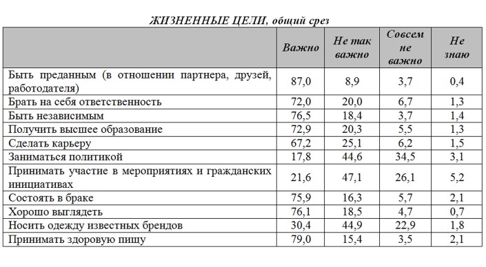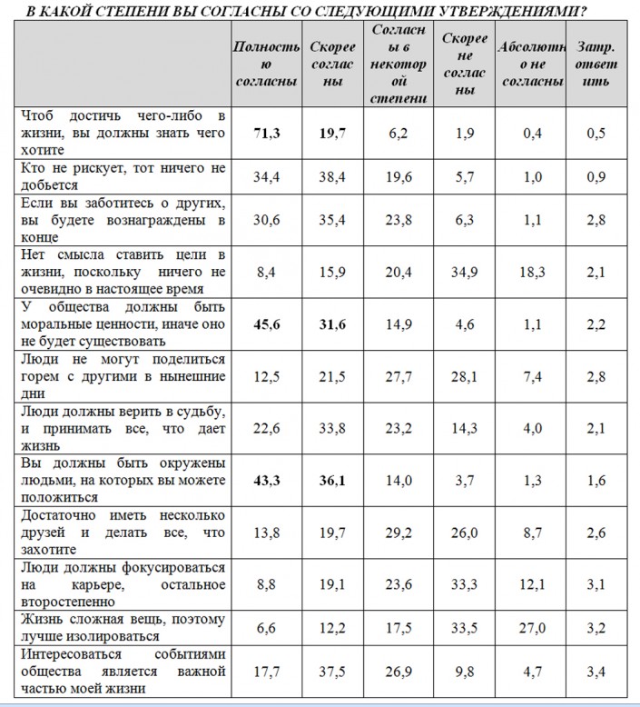 Также отмечено, что молодое поколение ориентировано на успех. При этом, уровень удовлетворенности своим положением, своими планами и своими достижениями на сегодняшний день достаточно высок. Большая часть молодых людей склоняется к тому, что для успеха в жизни они должны определиться с желаниями, иметь в окружении надежных людей, ставить цели, и соблюдать моральные ценности общества.