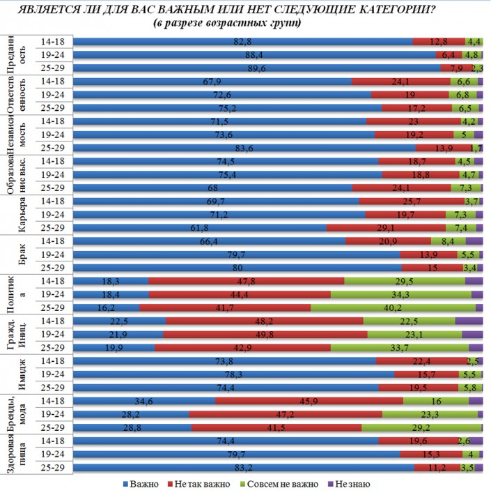 Также были обнародованы и другие интересные результаты исследования. Сообщается, что в основные жизненные планы молодежи Казахстана входит получение образования, создание семьи, построение карьеры. Так построение карьеры важно для 69,7 процента молодых людей в возрасте от 14 до 18 лет, 71,2 процента в возрасте от 19 до 24 и 61,8 процента в возрасте от 25 до 29 лет. Аналогичные результаты наблюдаются при ответе на вопрос о важности получения высшего образования. При этом девушки уделяют большее значение получению высшего образования и браку по сравнению с юношами (76,6 процента против 69,1 и 78,4 процента против 73,3 ).