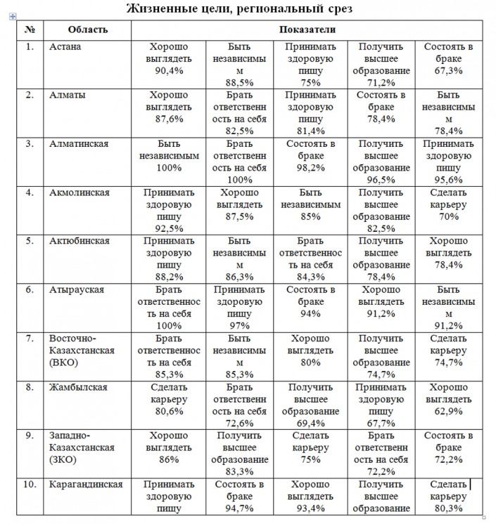 Для сельской молодежи важно быть преданным - 90,5 процента, употреблять здоровую пищу - 82,1 процента, иметь семью и брак - 80,3 процента. Среди регионов Алматинская область с цифрой в 98,2 процента лидирует по количеству молодежи, для которой важно состоять в браке. Карагандинская область стала лидером в вопросе здорового питания, Мангыстауская - по важности для молодых людей получить высшее образование и сделать карьеру. В Алматинской и Мангистауской области 100 процентов респондентов заявили о важности быть независимым. Также в Алматинской и Атырауской областях 100 процентов опрошенных считают важным брать ответственность на себя.