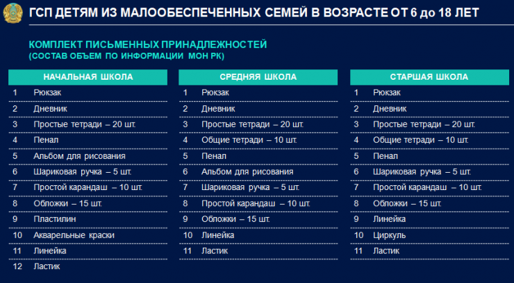 "В Послании Главы государства было поручено пересмотреть схему АСП и ввести гарантированный социальный пакет для детей дошкольного возраста. В правительстве решили, что будет правильно его составить в форме продуктового и гигиенического наборов. Перечень согласован с Министерством здравоохранения. В первую очередь набор продуктов представляет полезность. Это не означает, что набора хватит на месяц, он идет как дополнительная помощь", - сказал министр труда и социальной защиты населения Биржан Нурымбетов, отвечая на вопросы журналистов после пресс-конференции СЦК.