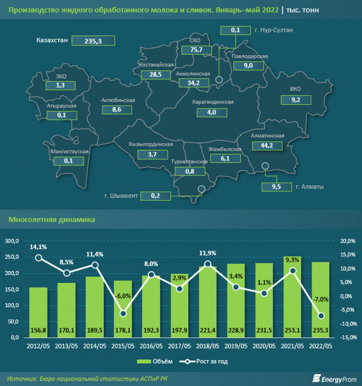Производство жидкого молока и сливок за январь - май этого года сократилось на 7 процентов по сравнению с предыдущим и составило 235,3 тысячи тонн. Это первое снижение темпов производства за шесть лет. Больше всего молока при этом произвели в Северо-Казахстанской (75,7 тысячи тонн) и Алматинской (44,2 тысячи тонн) области.
