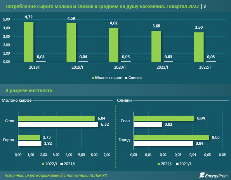 Потребление молока в разрезе местности значительно разнится. В городской местности в первом квартале 2022 года потребление составляло 1,73 литра сырого молока в среднем на душу населения, в сельской местности - сразу 6,04 литра.