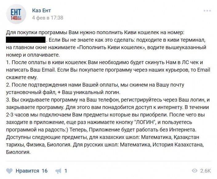 В социальных сетях начали продавать программу, которая якобы помогает набрать хорошие баллы на ЕНТ. Об этом в Facebook написал алматинец Дидар Марданов, передает корреспондент Tengrinews.kz.