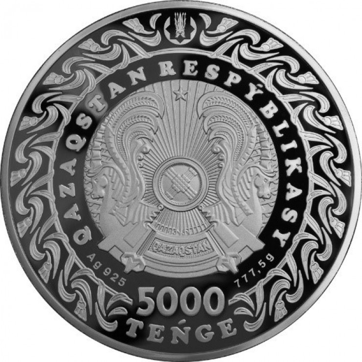 2) из серебра 925/1000 пробы качеством proof, номиналом 5 000 тенге, массой 777,5 грамма, диаметром 100 миллиметров, тиражом 250 штук.