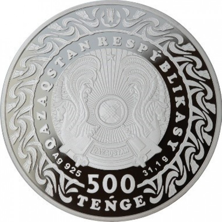 3) из серебра 925/1000 пробы качеством proof, номиналом 500 тенге, массой 31,1 грамма, диаметром 38,61 миллиметра, тиражом 3 000 штук.