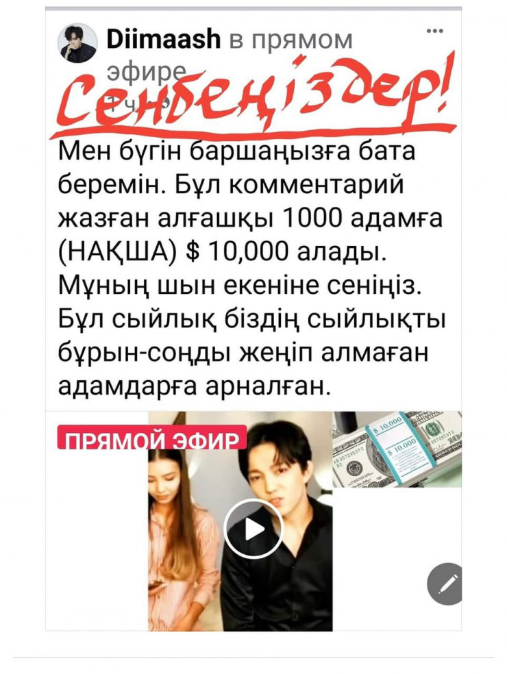 Для правдоподобности мошенники сопроводили публикацию от имени Димаша Кудайбергена прямым эфиром со старым видео певца.
