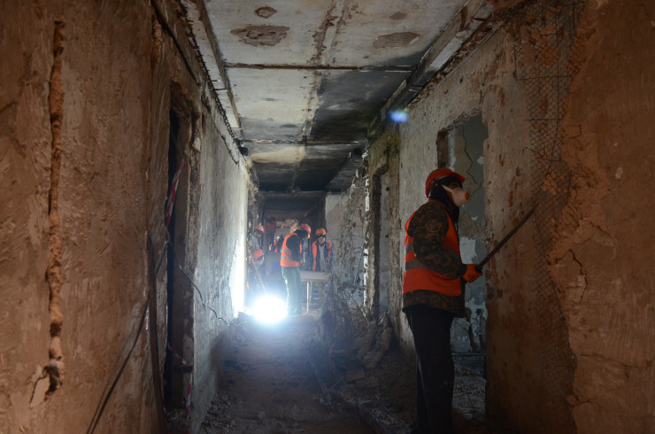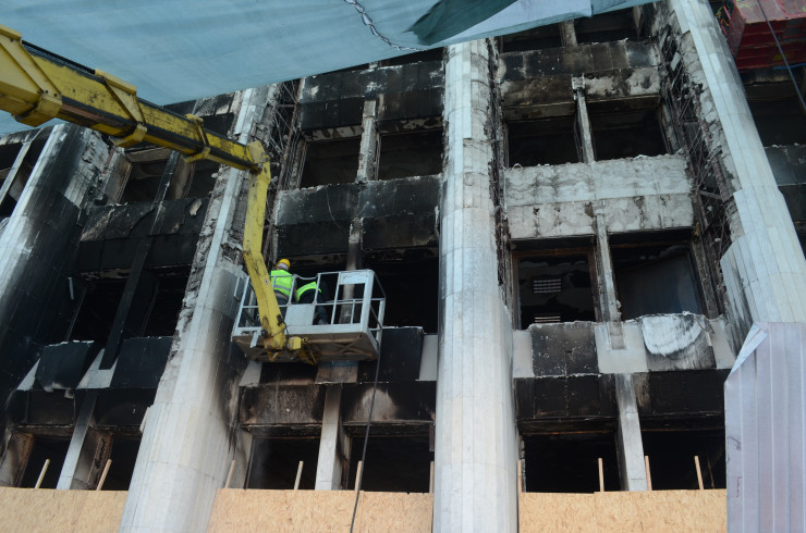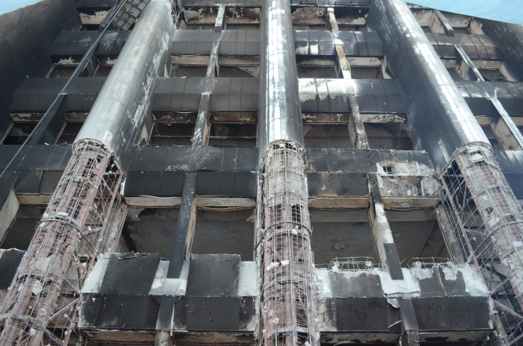 "Огрехи в здании были еще до пожара, так как оно строилось "с листа" и были отклонения от первоначального проекта в железобетонных конструкциях. Основным повреждениям из конструкций поверглись ригеля, несущие и ненесущие. Здание само по себе имеет железобетонной каркас. Несущие конструкции были обшиты отделкой и гипсом и меньше поверглись огню. Однако требуется провести сейсмоусиление с учетом действующих строительных норм. Фасад же подлежит замене, потому что через окна он подвергся огневому воздействию. Было нарушено сцепление между раствором и отделкой, и есть риск обрушения плит", - сообщил управляющий директор по производству АО "КазНИИСА" Ералы Шокбаров.