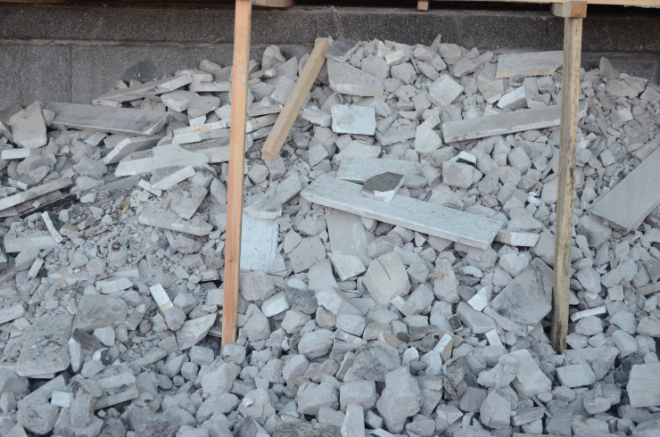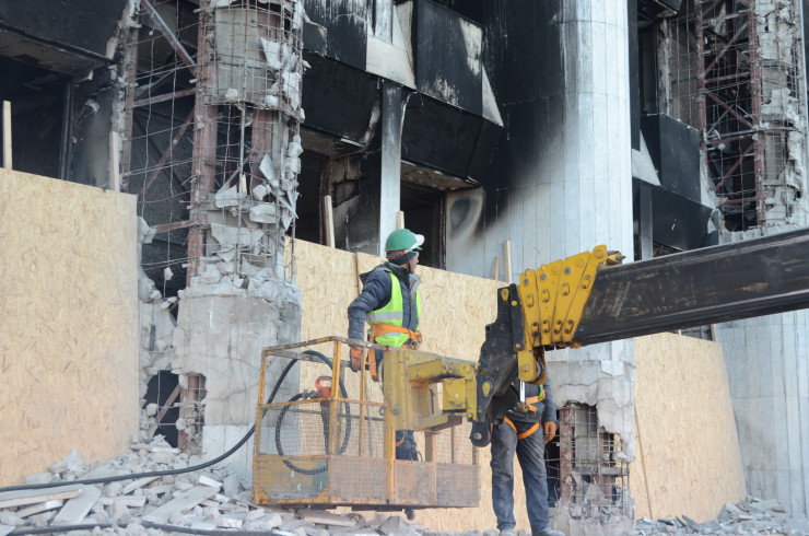 Закопченный фасад здания городского акимата затянули зеленой сеткой. Под ней ведутся активные работы по зачистке от обгоревших частей. Почерневшая от гари мраморная плитка и куски бетона отлетают прямо на землю. Фактически рабочие снимают всю облицовку здания и частично разбирают его конструкции.