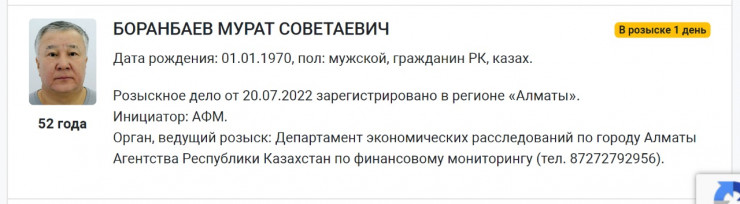 Агентство по финансовому мониторингу объявило в розыск бизнесмена Мурата Боранбаева, передает Tengrinews.kz.