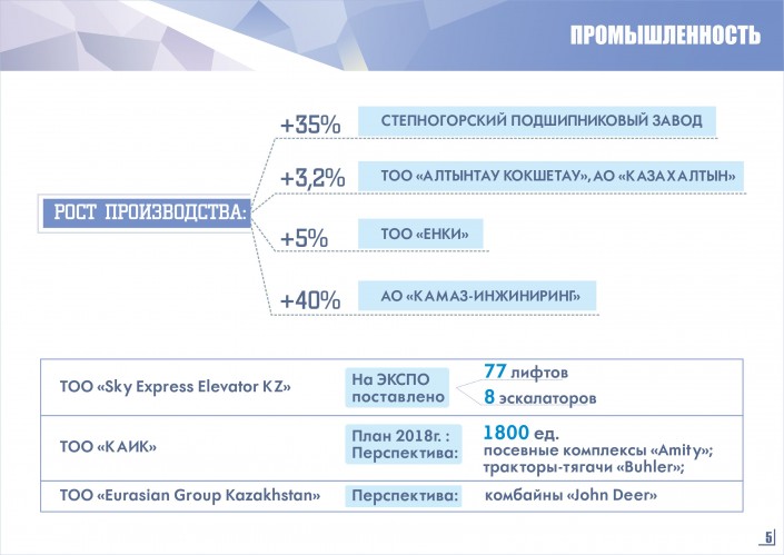 Регион позиционирует себя более как индустриальный, что было продемонстрировано в выступлении докладчика, сообщает управление внутренней политики. "В 2017 году доля обрабатывающей отрасли  в промышленном производстве достигла 80 процентов - четвертое место по РК", - отметил глава региона.