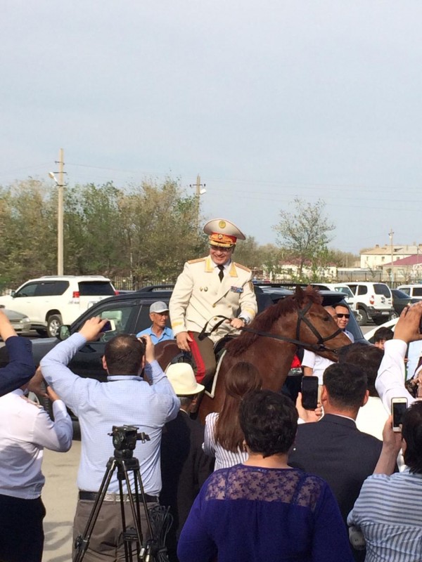 На кадрах человек, похожий на начальника ДП Атырауской области Аяна Дуйсембаева, влезает на коня под аплодисменты людей, в том числе одетых в полицейскую форму.
