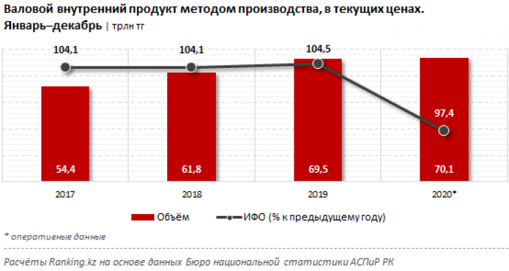Валовой внутренний продукт (ВВП) в Казахстане, по оперативным данным, за январь – декабрь 2020 года составил 70,1 триллиона тенге - на 2,6 процента меньше, чем за аналогичный период прошлого года, передает Tengrinews.kz со ссылкой на Ranking.kz.