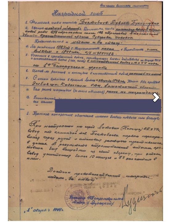 В канун Дня Победы в Великой Отечественной войне астанчанка Ольга Бектибаева поделилась воспоминаниями о подвигах своего деда, который сражался рядах 1-го Белорусского фронта за Ковель, Седлец и Варшаву. В беседе с корреспондентом Tengrinews.kz она рассказала, что пошла по стопам деда и стала юристом.