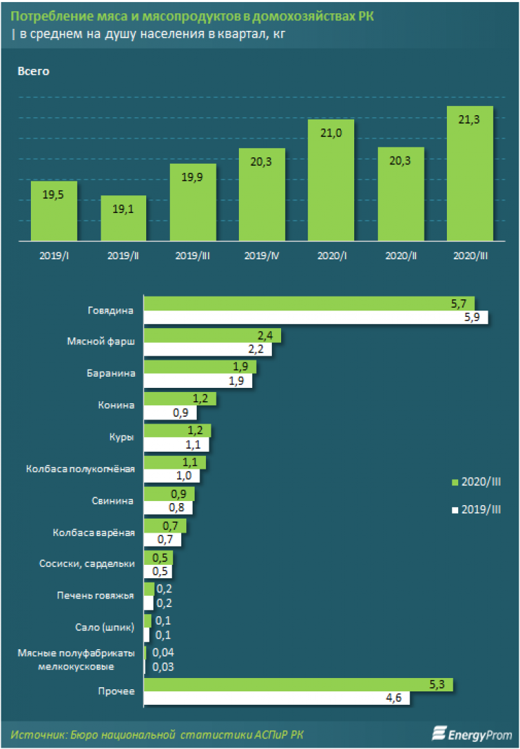 В третьем квартале 2020 года каждый казахстанец употребил в среднем 21,3 килограмма мяса и мясопродуктов. Это на 1 килограмм больше, чем во втором квартале 2020 года, и на 1,4 килограмма больше по сравнению с третьим кварталом 2019-го. Сообщается, что потребление мясных продуктов в стране увеличилось на семь процентов за год.